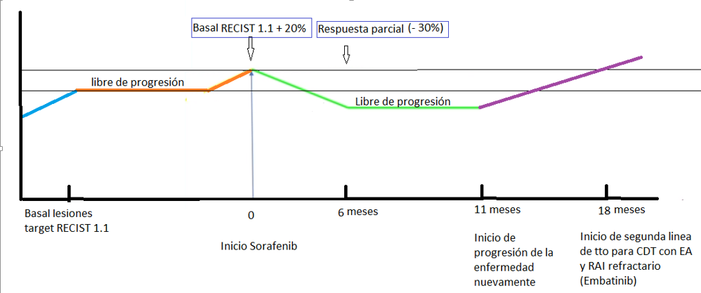 El sorafenib se administra por todo el tiempo que el paciente permanece libre de progresión (cerca de 11 meses) y se mantiene hasta que la progresión alcanza nuevamente su condición basal o sea se pierde la reducción mayor al 30% que había logrado en la respuesta parcial (lo cual sucede aproximadamente a los 18 meses), y en este momento se suspende y se pasa a la segunda línea de quimioterapia en estos pacientes, que en los EUA es el Embatinb (en Colombia no está aprobado y por tanto en este caso se usan fármacos off-label);