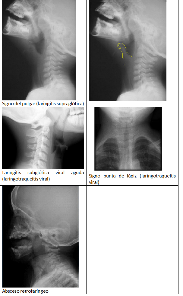 .- Rx de cavum faríngeo en laringitis supraglótica o epiglotitis: Epiglotis engrosada con “signo del pulgar”, engrosamiento de pliegues aritenoepiglóticos y ensanchamiento de hipofaringe.