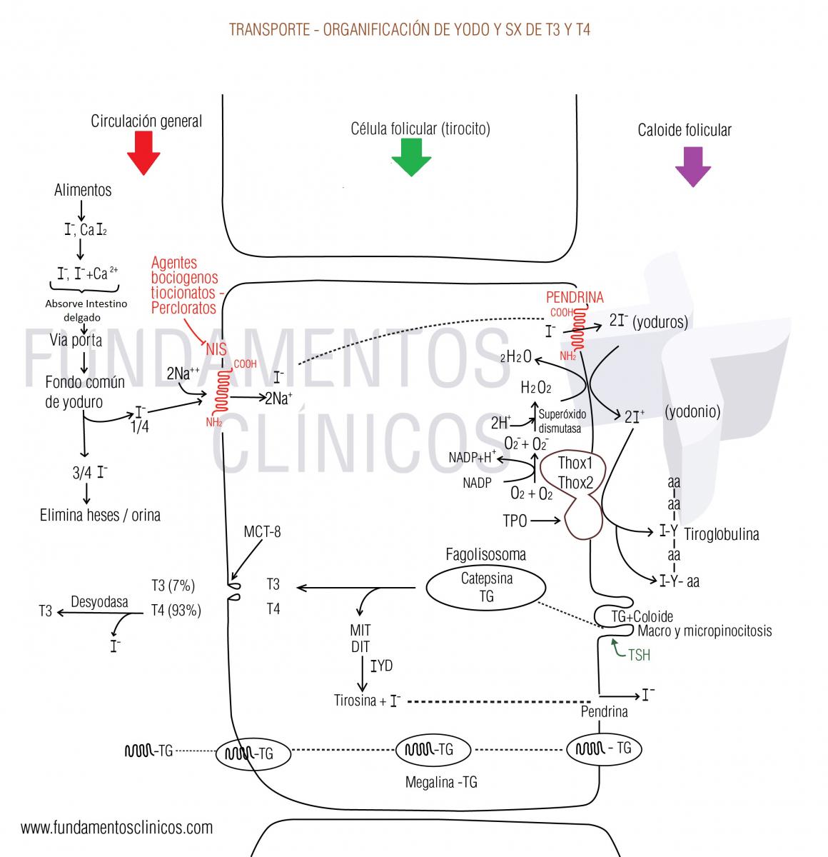 3.c).- Secreción de las HT a la circulación general. La T3 y T4 liberadas por la catepsina son traslocadas a la circulación general al parecer por unos transportadores de aminoácidos o monocarboxilatos – 8 (MCT-8) a través de la zona basal de tirocito. La T4 se libera en mucha mayor cantidad que la T3 (llegando a ser hasta 80 mcgr/día). Los MIT y DIT liberados permanecen en el citoplasma del tirocito y debido a que son inactivas biológicamente y que tampoco pueden ser recicladas e incorporadas en esta forma a la Tiroglobulina con el fin de sintetizar hormonas, deben ser deiodadas con la liberación de iodo y tirosina, lo cual es llevado a cabo por la enzima yodo tirosina deshalogenasa tipo 1 (DEHAL1) o llamada también yodo tirosina desyodinasa (IYD), ahora si este yoduro y esta tirosina liberada pueden ser nuevamente reutilizadas en la hormonogenesis. La MIT y DIT contienen las 2/3 del iodo que posee una molécula de TG o sea que el iodo de la T3 y T4 es solo 1/3 del iodo que posee la TG. Esta enzima también hace parte de las NADPH oxidasas/flavino reductasas.