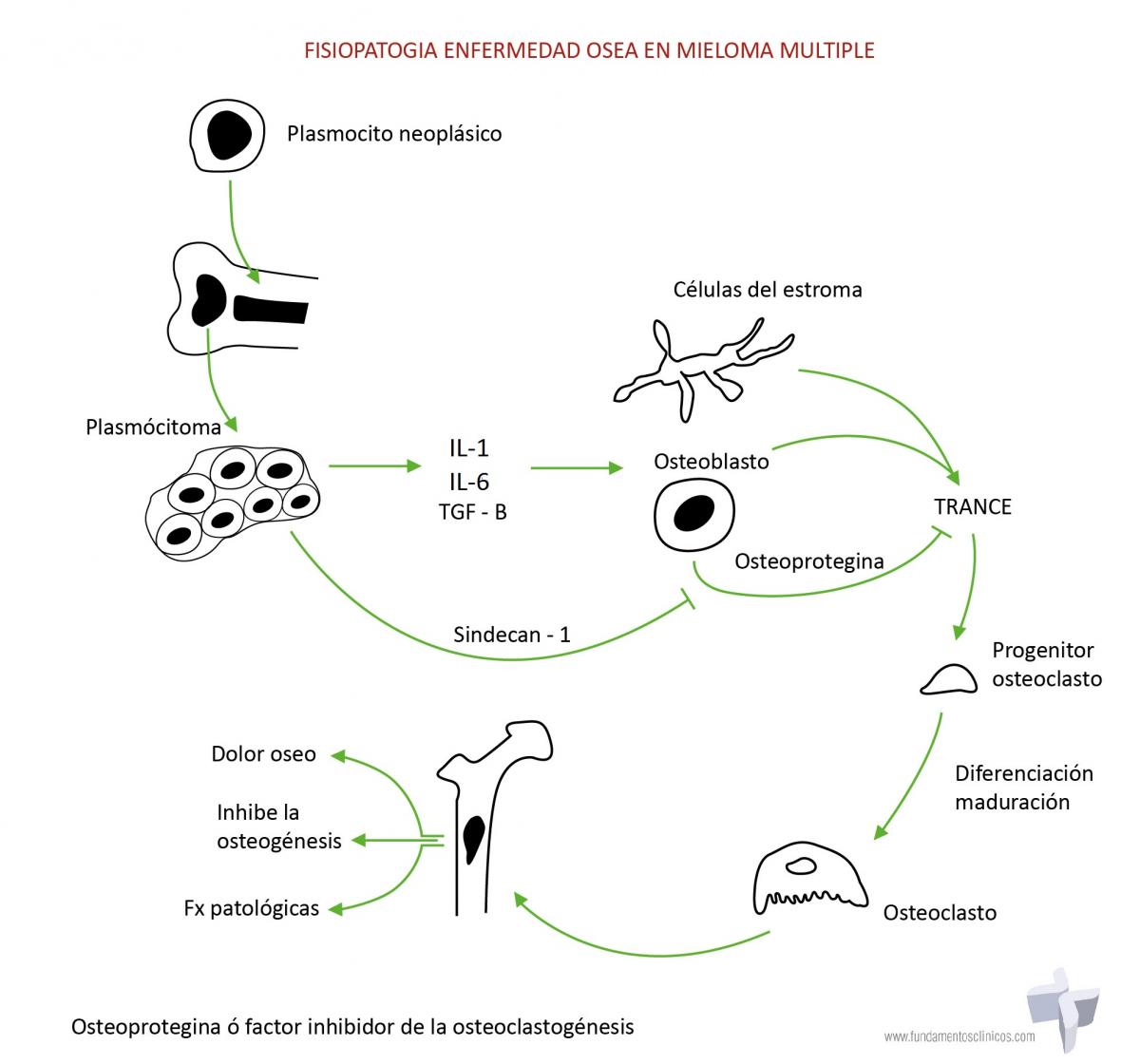 • Síntomas de lesión ósea: Dolor óseo lumbar (lumbago), reja costal y extremidades (60% casos), se asocia al movimiento, sede en reposo y la noche. Se presenta principalmente en los huesos y áreas que poseen médula roja (porque es donde reingresan los plasmocitos neoplásicos provenientes de la circulación) y coincide con las lesiones líticas y osteopénicas visibles en las imágenes. La lesión ósea se debe que cuando los plasmocitos neoplásico (PN) se anidan en el estroma de la médula ósea sintetizan citoquinas IL1, IL6 y TGF-beta que inducen a que las células del estroma y los osteoblastos sinteticen otra citoquina denominada TRANCE, citoquina esta que induce la diferenciación y maduración de los progenitores de los osteoclastos. La TRANCE es inhibida por una proteína denominada osteoprotegerina (o factor inhibidor de la osteoclastogenesis) que es sintetizada por los osteoblastos, pero esta última es inhibida por otra molécula sintetizada por los PN denominada sindecan-1, y entonces el desbalance entre aumento de TRANCE y bloqueo de la osteoprotegerina, lleva a la activación de la función osteoclástica. Además la actividad osteoclástica inducen las células del estroma a  sintetizar citoquinas que inducen a la proliferación de más PN. Las consecuencias de esta actividad osteoclástica son el dolor óseo severo; las fracturas patológicas, especialmente por compresión vertebral en cuña, las lesiones osteolíticas por resorción ósea severa en las proximidades de los plasmocitos neoplásicos con inhibición severa de la osteogénesis.