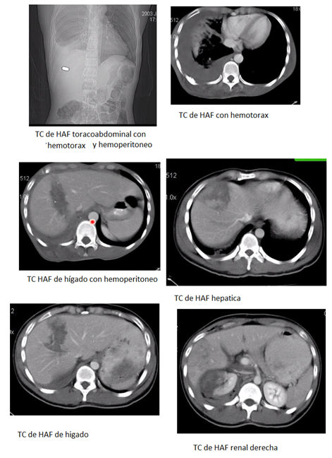 El hallazgo más común es el hemoperitoneo que se visualiza en la TCMC como líquido intraabdominal hiperdenso (color oscuro en señal potenciada tipo T1 con coeficiente de atenuación de UH similar al agua o sea más oscura que el coeficiente de atenuación de víscera maciza como hígado).